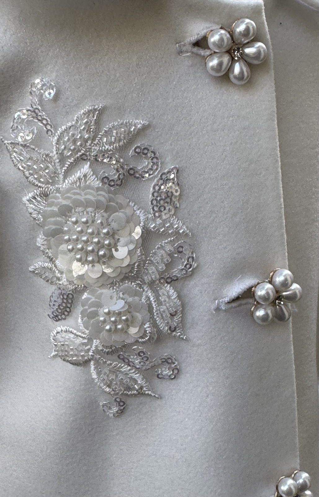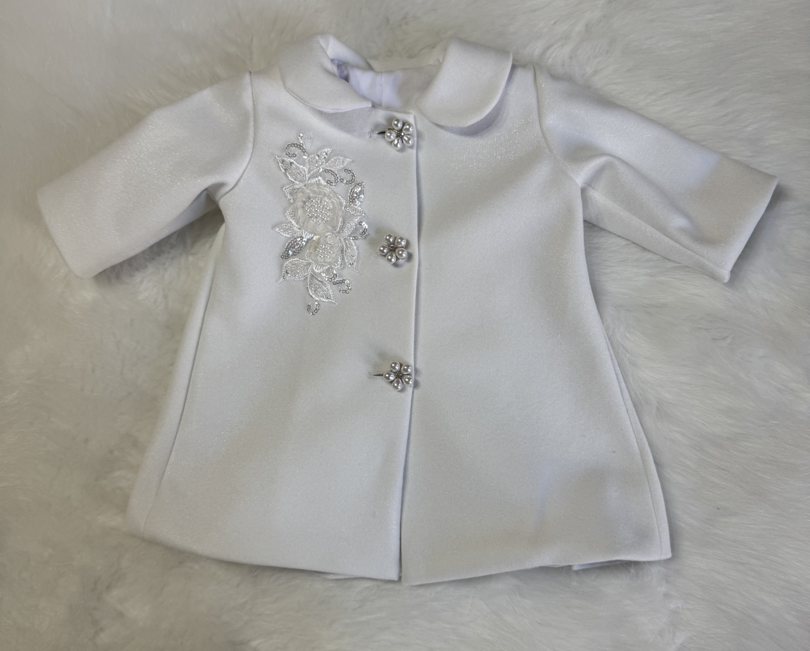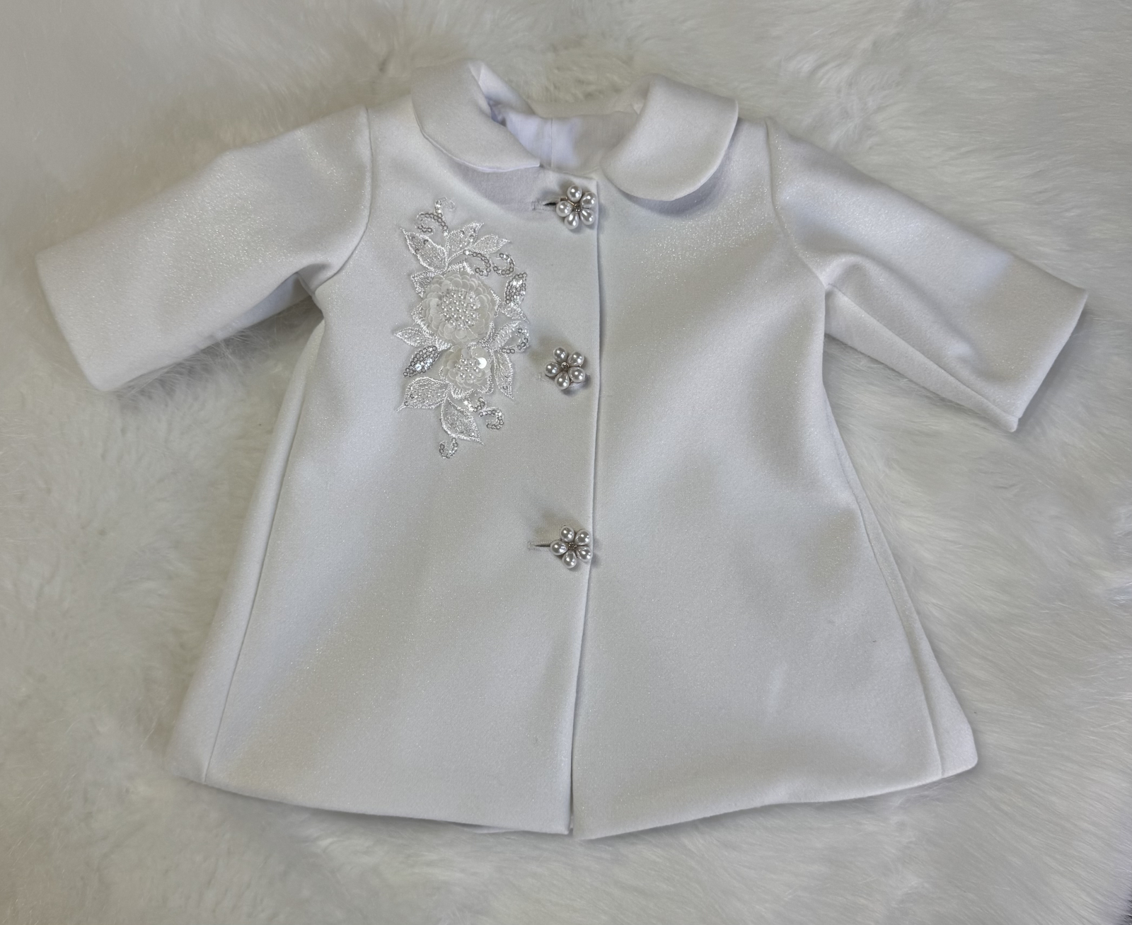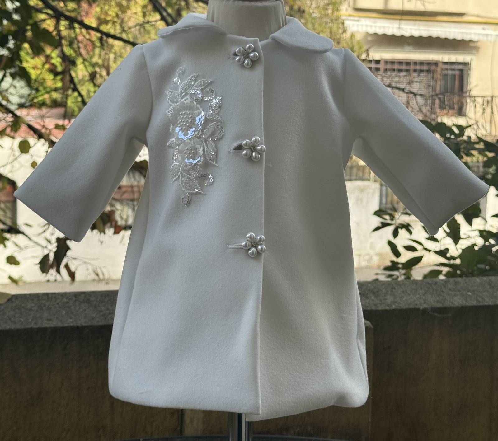 Realizat din stofa sidefata ivoire si captusit cu bumbac, paltonasul asigura cu eleganta confortul termic al micutei. Croiala si atentia la detalii asigura eleganta si confort. Este o alegere deosebita pentru orice ocazie si este foarte potrivita pentru evenimente (botez, aniversari) sau sedinte foto, putand fi, deasemeni, un cadou minunat.