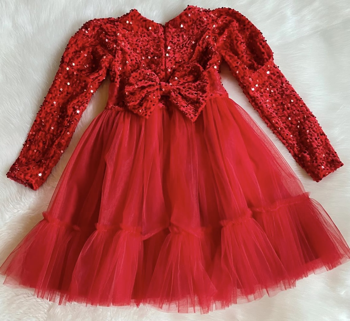 Rochiță elegantă roșie, realizată în România, cu corset strălucitor din catifea accesorizata cu paiete și fustă amplă din tulle fin. Mânecuțele bufante și fundița delicată din talie, precum si funda ampla din spate, completează perfect acest model plin de rafinament, ideal pentru evenimente speciale.