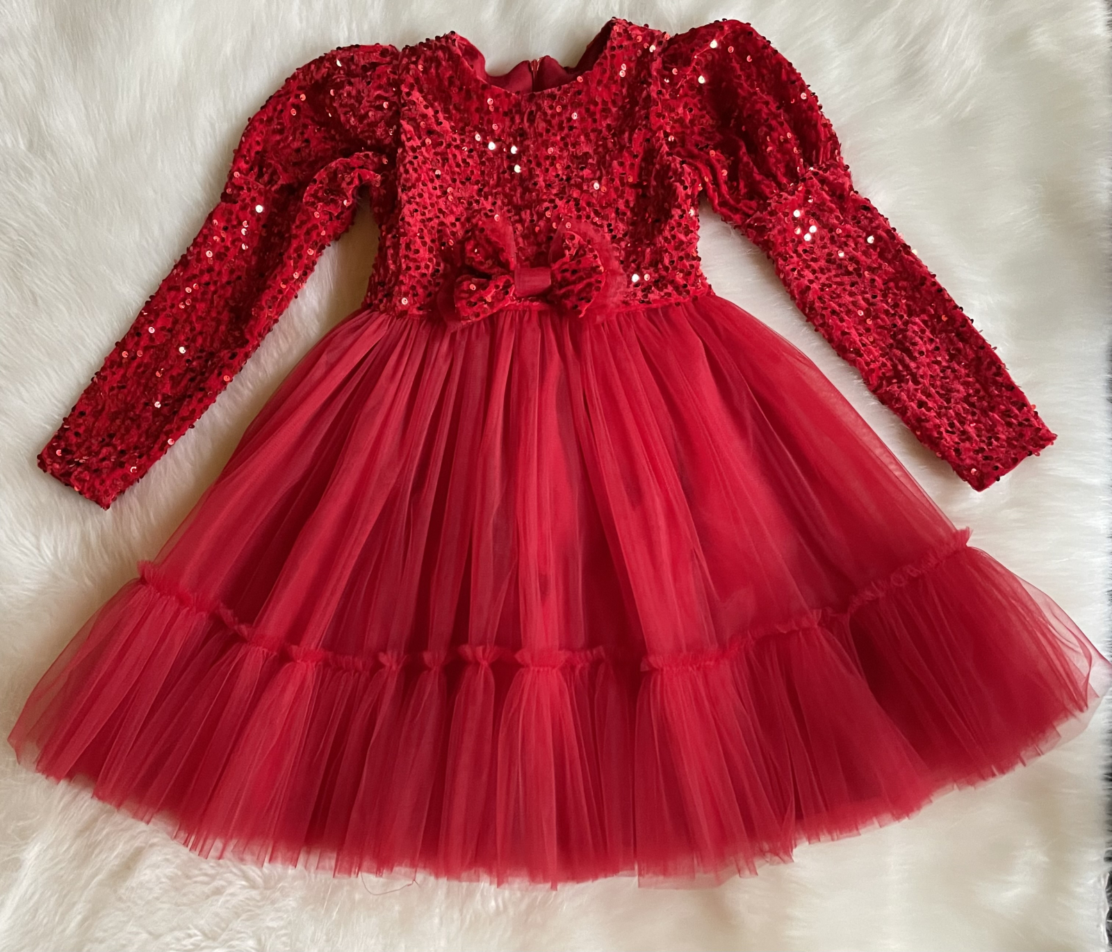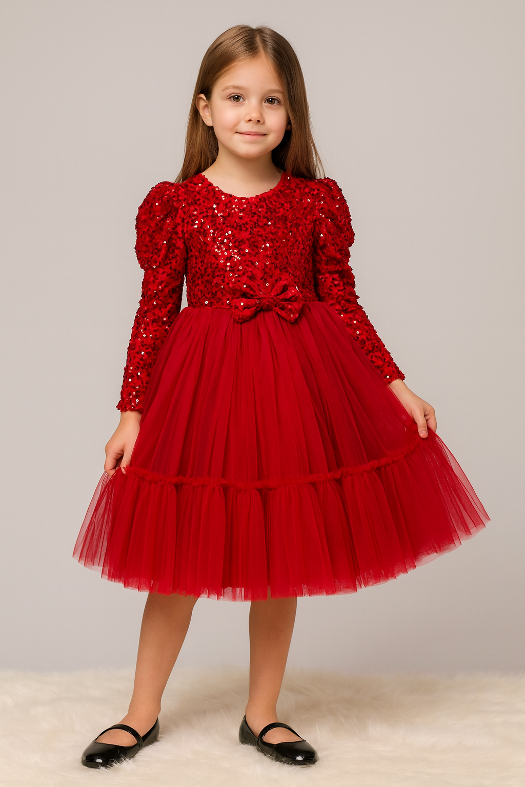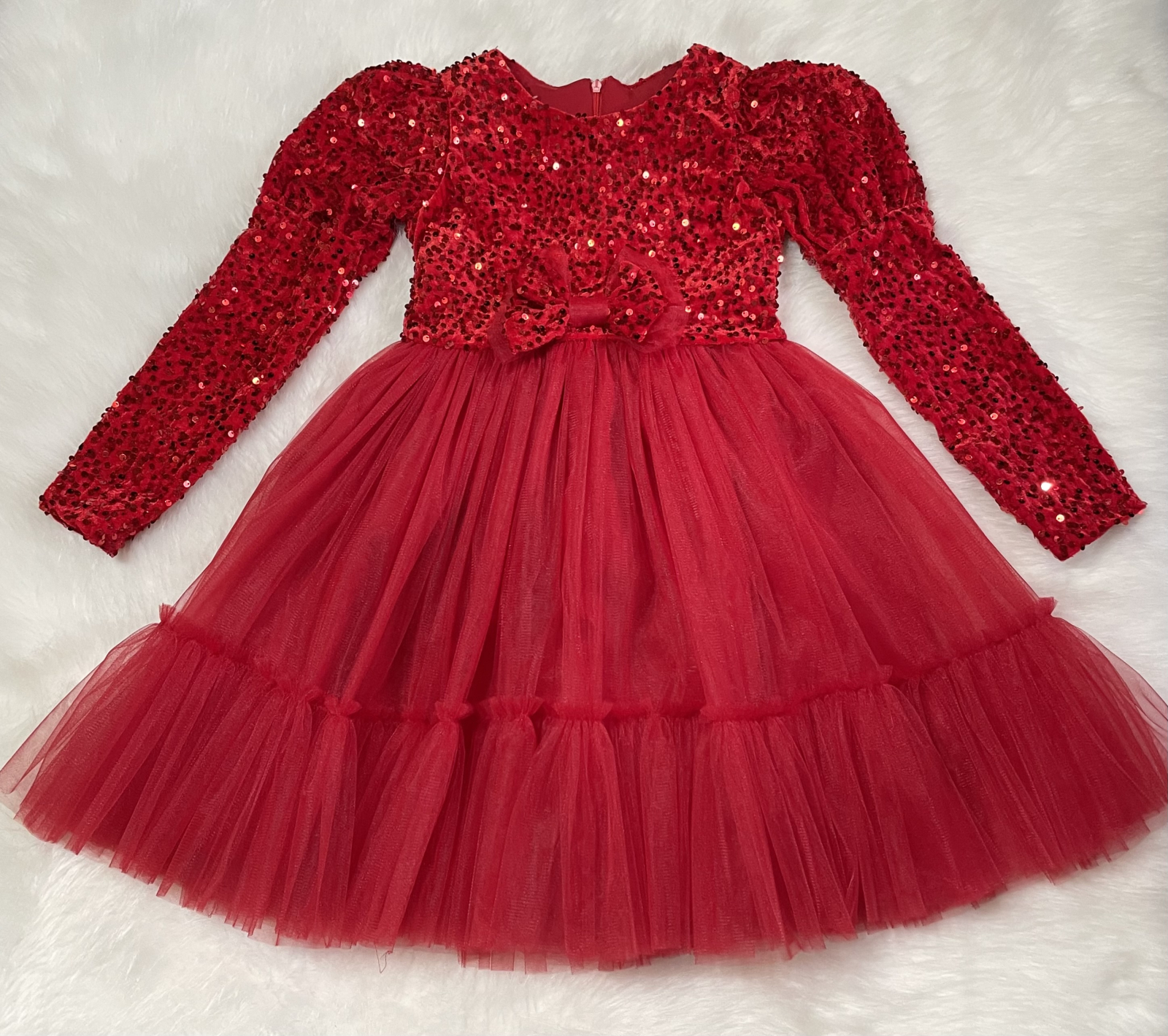 Partea superioară este realizată din catifea fina accesorizata cu paiete roșii de înaltă calitate, care captează frumos lumina și adaugă un plus de glamour. Mânecuțele bufante oferă un aer sofisticat și delicat.