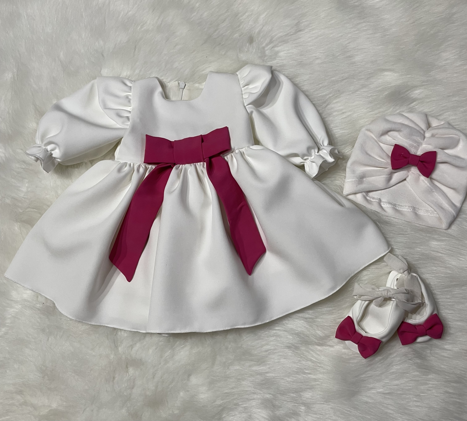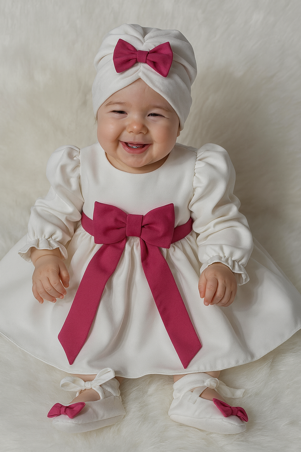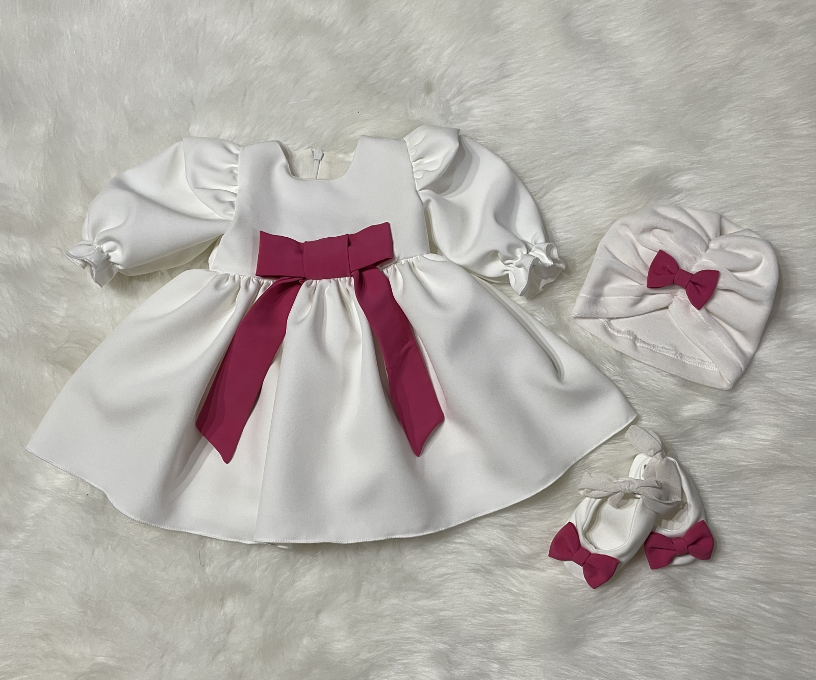 Transformă fiecare moment special într-o amintire de neuitat cu acest set adorabil pentru fetițe! Rochița ivoire, cu croi fluid și mâneci lungi, este realizată dintr-un crep fin, delicat. Funda fuchsia elegantă oferă un accent fermecător, perfect pentru fotografii și evenimente deosebite.