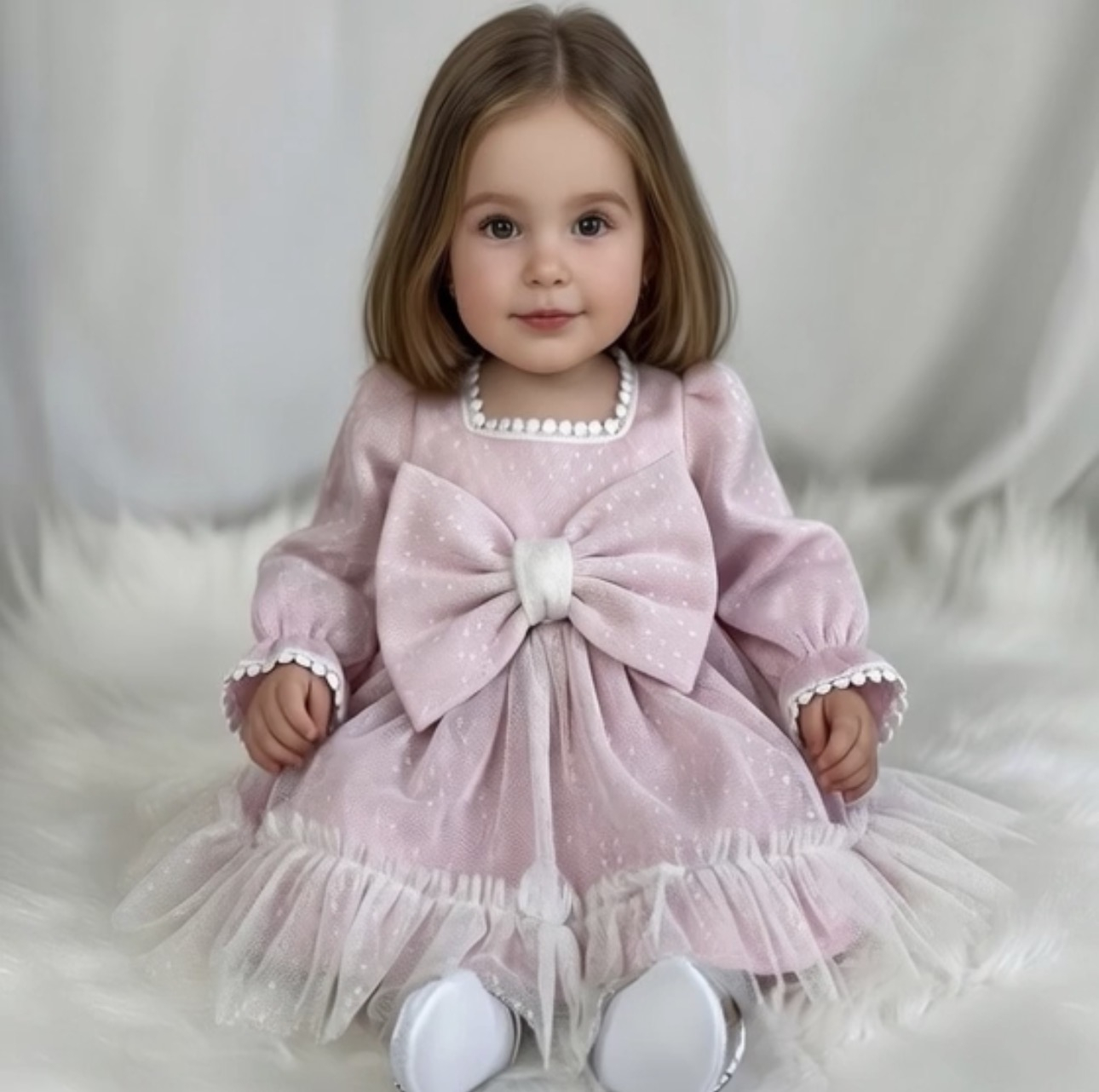 Confecționată din materiale atent alese, rochița are un bust elegant decorat cu o fundă amplă în partea frontală, iar fustița este completată de un strat vaporos de tul fin cu buline discrete, oferind un plus de volum și grație. Mânecile lungi sunt finisate cu dantelă delicată, pentru un aer clasic și feminin. ESTE CAPTUSITA INTEGRAL CU BUMBAC.