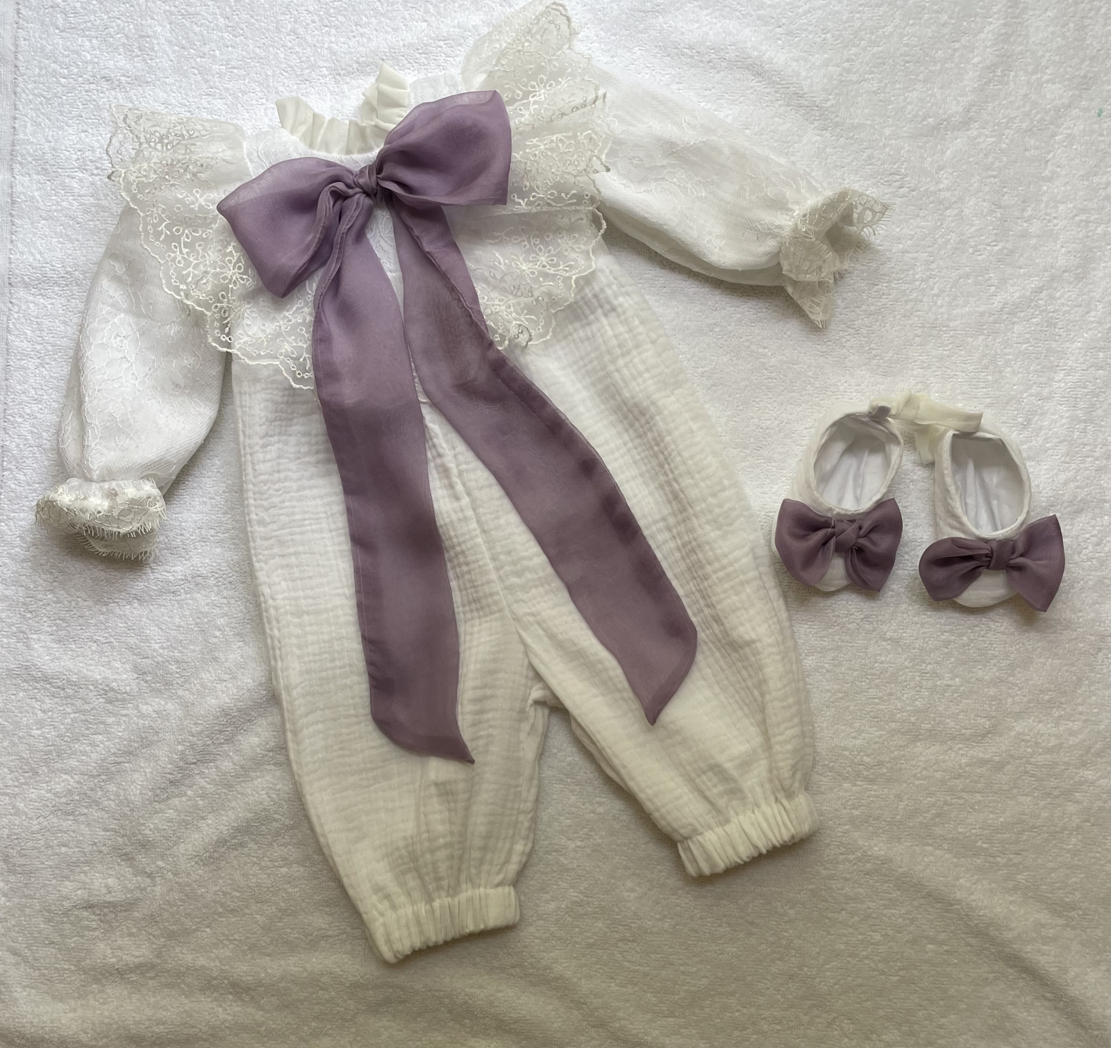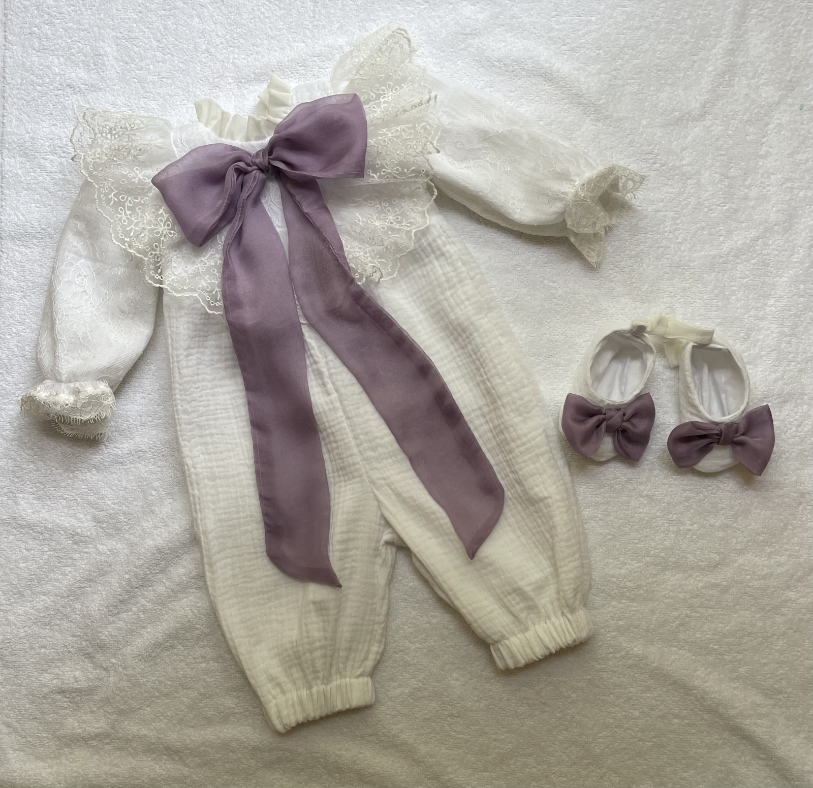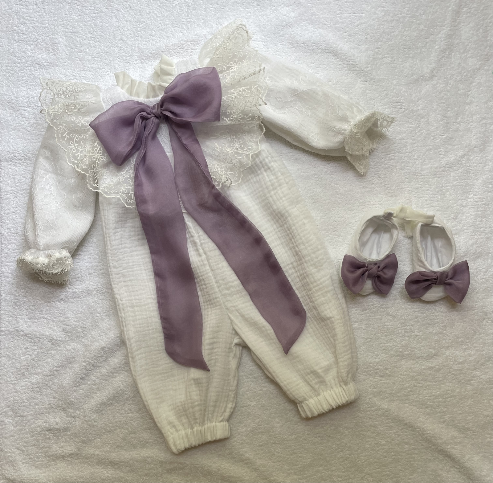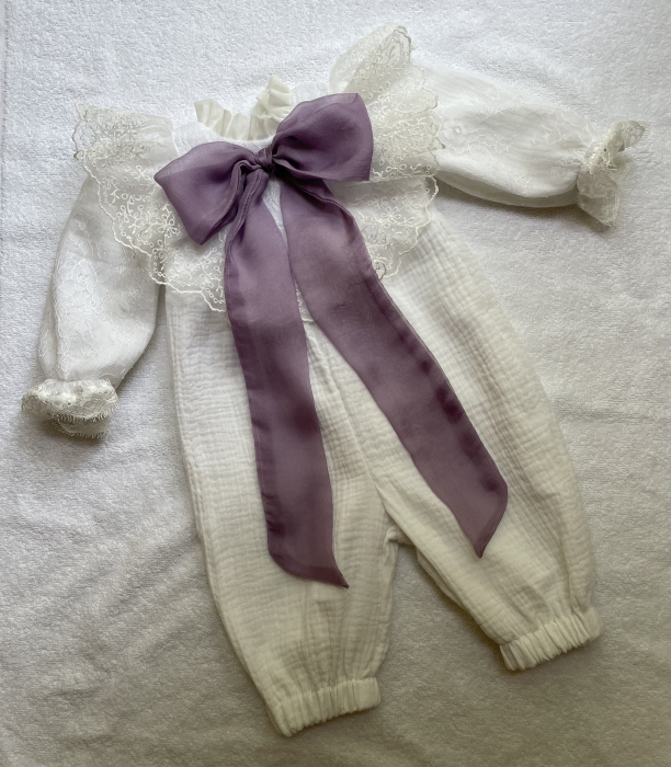 Modelul este îmbogățit cu dantelă fină la gât și la manșete, detalii care oferă un aer romantic și rafinat. Funda decorativă amplă completează armonios designul, transformând salopeta într-o piesă specială, potrivită pentru botez, evenimente festive sau ședințe foto.
