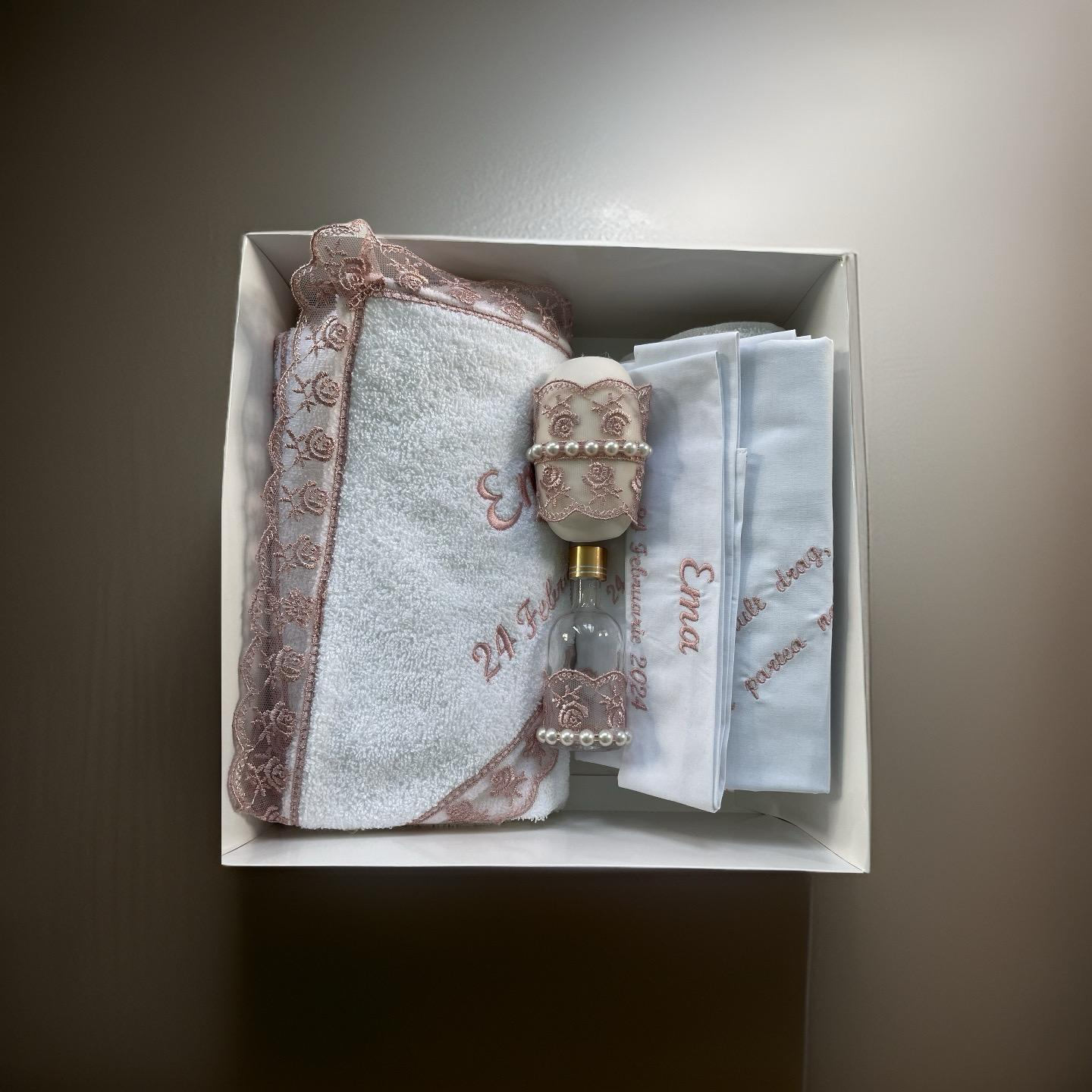 Daca se opteaza pentru personalizarea trusoului, prosopul cu capison, panza de mir si fasa vor primi o superba broderie, in culoarea aleasa de dumneavoastra, cu numele de botez al copilasului si data crestinarii. Pretul personalizarii este de 100 lei.